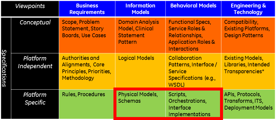 FHIR resources and RESTful APIs represent the “Physical Models” and “Interface Implementations” within the Platform Specific Specifications layer of the