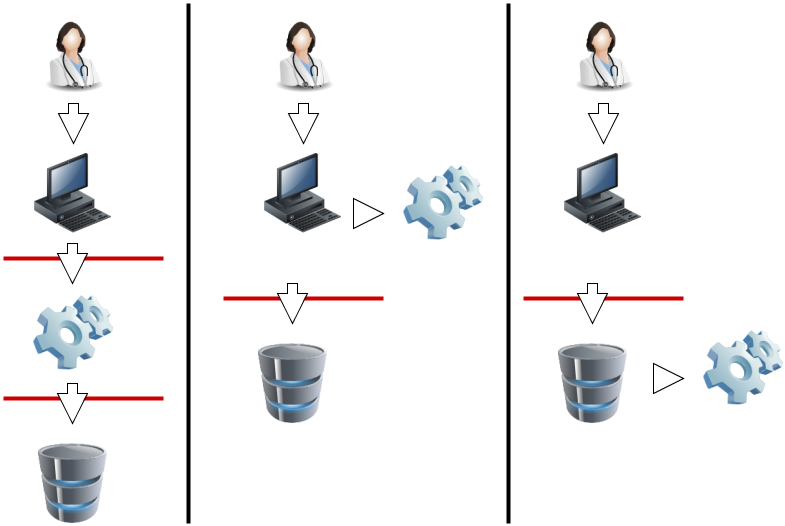 In this diagram, the red lines represent FHIR interfaces. From the perspective of the FHIR API, the client (consumer of FHIR services) may either interact with a security system that manifests as a FHIR server, and which depends on a subsequent FHIR interface to provide the actual storage, or either the client or server interacts with the security system independently. In each of these 3 scenarios, the different components may be assembled into applications or network components differently, but the same logical layout applies. The FHIR specification assumes that a security system exists, and that it may be deployed in front of or behind the FHIR API.